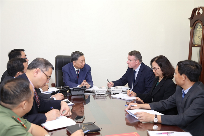 Bộ trưởng Tô Lâm cũng mong muốn Bộ Nội vụ Anh có biện pháp ổn định an ninh, an toàn của công dân Việt Nam đang học tập và sinh sống tại Anh. Đồng thời mong muốn thời gian tới, Bộ Công an Việt Nam và Bộ Nội vụ Anh sẽ thúc đẩy có hiệu quả hơn nữa hợp tác trong đấu tranh phòng chống tội phạm xuyên quốc gia, trong đó có tội phạm buôn bán người, góp phần bảo đảm an ninh trật tự của hai quốc gia.