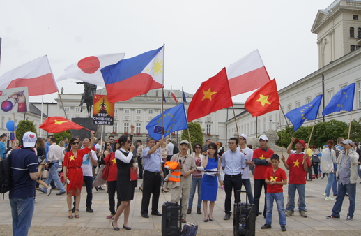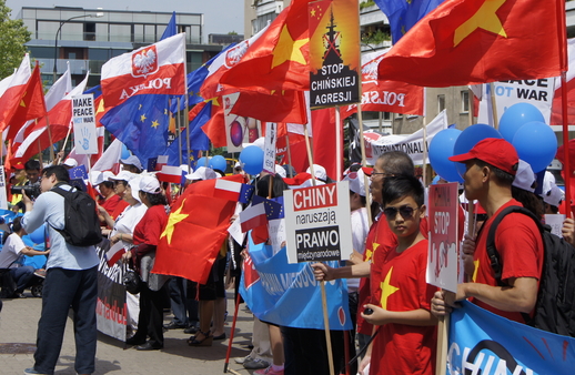 Những người biểu tình giơ cao cờ Việt Nam, Ba Lan, Liên minh Châu Âu, Nhật Bản và Phillippin.