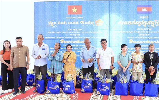 Ban tổ chức trao tặng quà Tết cho người dân Campuchia và người gốc Việt tham gia chương trình “Ấm tình mùa Xuân” - Xuân Giáp Thìn 2024. Ảnh: TTXVN |