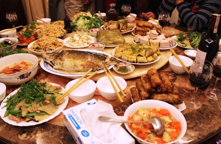 Mặc dù mỗi người một ngành, một nghề, một nơi chôn nhau, cắt rốn, nhưng ở nơi xứ lạ, họ trở nên thân thiêt, gần gũi như con trong một gia đình mang tên Mẹ Việt Nam. Mâm cơm tất niên chiều 30 Tết ở nơi xứ sở tuyết trắng, nhưng có đầy đủ từ: bánh chưng, dưa, hành, thịt gà, nem, măng, miến, mọc, giò lụa, giò xào và còn rất nhiều thứ khác nữa. Đặc biệt còn có cả một mâm cỗ chay được bày biện thật cẩn thận để mời giáo thọ sư Chùa Nhân Hòa và một vài phật tử cùng chia vui…Có được không khí đầm ấm, an vui, những bạn bè của vợ chồng anh Quý, chị Hoa đã tới từ sớm cùng nhau chuẩn bị bữa cơm chiều. Chị Kiều Kim Oanh cho biết: Mặc dù xa quê hương nhưng những món ăn ngày Tết thì không thể thiếu được ví dụ như bánh chưng thì có nếp, có lá có thịt mua về gói, còn nếu gia đình nào không có điều kiện thì có thể mua ở cửa hàng Á Châu cùng có đầy đủ cả.