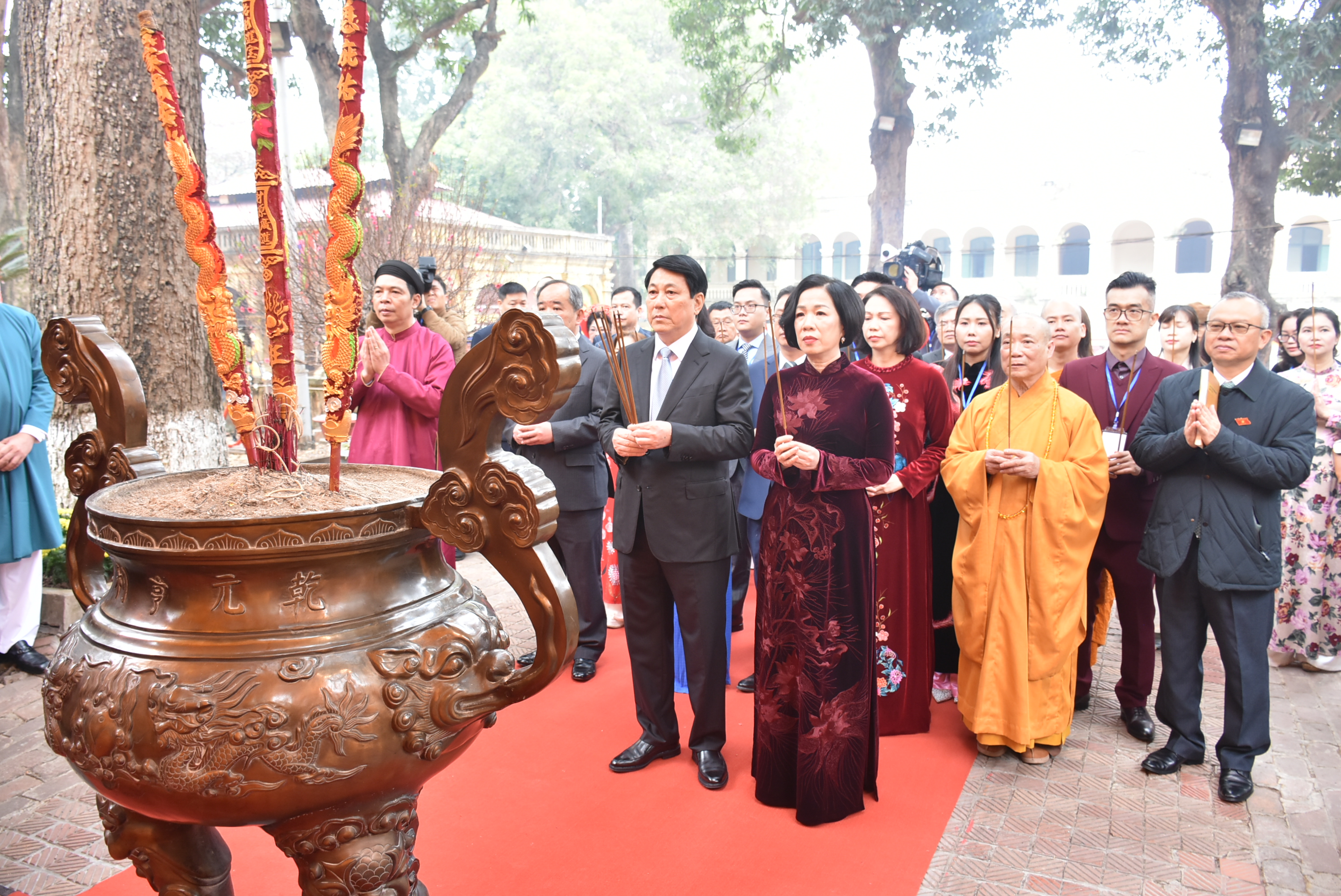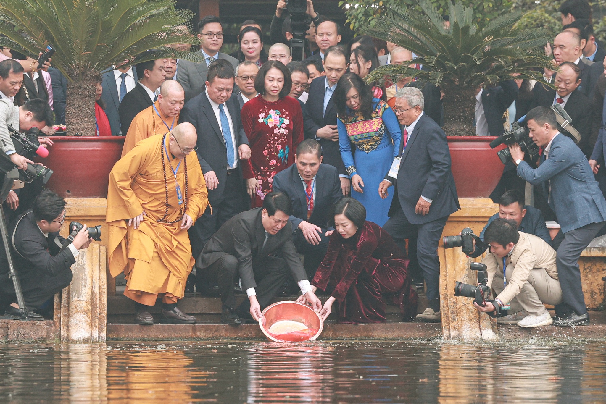 Tiếp đó, Chủ tịch nước Lương Cường và Phu nhân, đại diện Lãnh đạo các ban, bộ, ngành trung ương, TP Hà Nội cùng Đoàn kiều bào đã dâng hương tại Điện Kính Thiên trong Di tích Hoàng Thành Thăng Long. Trong khu Di tích Phủ Chủ tịch, kiều bào tiêu biểu cùng Chủ tịch nước Lương Cường và Phu nhân đã thực hiện nghi lễ truyền thống thả cá chép tiễn ông Công, ông Táo tại Ao cá Bác Hồ.