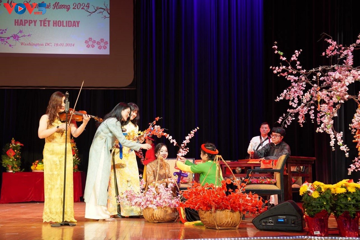 Hoạt cảnh ngày Tết do các cán bộ Đại sứ quán và các cơ quan bên cạnh thực hiện. Ảnh: PV/VOV-Mỹ |
