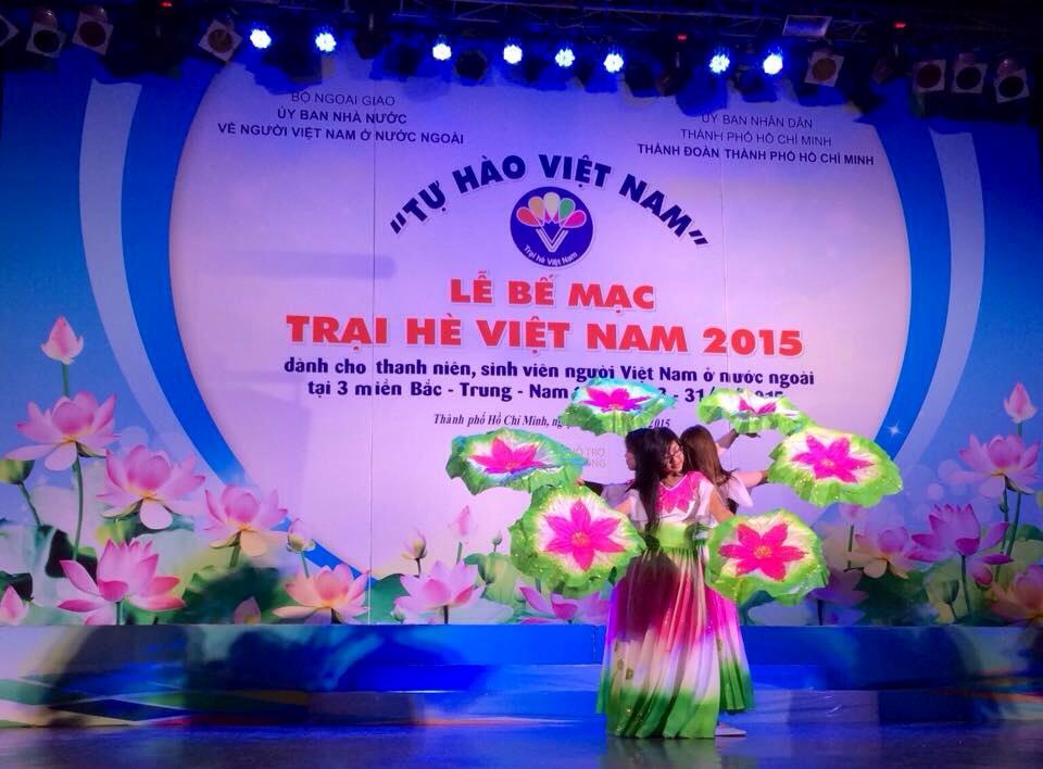 | Ba bạn trong nhóm múa biểu diễn tiết mục Sen hồng tại lễ bế mạc Trại hè Việt Nam 2015 |