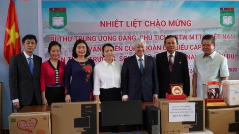 Chủ tịch Ủy ban Trung ương Mặt trận Tổ quốc Việt Nam Đỗ Văn Chiến thăm Trường song ngữ Lào - Việt Nam Nguyễn Du