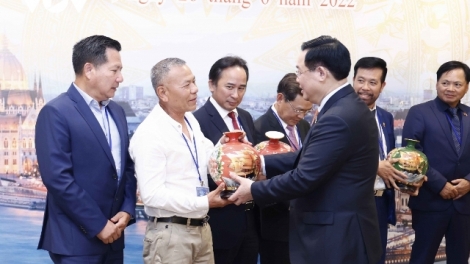 (VOV5) - Chủ tịch Quốc hội Vương Đình Huệ nhấn mạnh trong thành tựu chung đó có sự đóng góp không nhỏ của cán bộ, nhân viên Đại sứ quán Việt Nam tại Hungary và cộng đồng người Việt Nam tại Hungary.