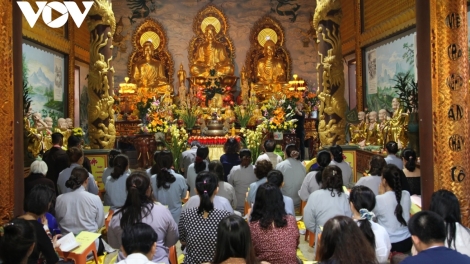 (VOV5) - Sáng 26/2, tức Rằm tháng Giêng năm Tân Sửu, chùa Phật Tích-Vientiane dự Lễ tụng kinh nguyện cầu quốc thái an.