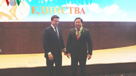 (VOV5) - Đại sứ đặc mệnh toàn quyền Việt Nam tại LB Nga, Nguyễn Thanh Sơn được tặng Huy hiệu Thánh nhân ngày Thống nhất Toàn dân (7/11).