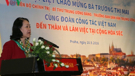 (VOV5) - Bà Trương Thị Mai đánh giá cao mô hình tổ chức, hoạt động của Hội người Việt Nam tại Cộng hòa Czech đã tập hợp và phát triển thành một mạng lưới các chi hội, đoàn thể thành viên trực thuộc tại hầu hết các tỉnh, thành của Cộng hòa Czech.