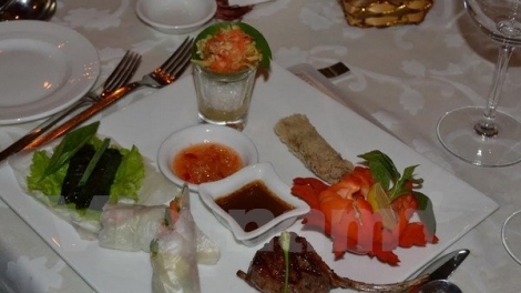 (VOV5) - Hai đầu bếp Doãn Văn Tuấn và Nguyễn Huy Hoàng của khách sạn Furama Đà Nẵng giới thiệu với các thực khách các món ăn của Việt Nam như gà cuốn lá lốt, gỏi xoài, phở cuốn, nem rán và món phở truyền thống.