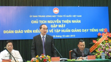 (VOV5) - Sáng 16/10, Ủy ban trung ương Mặt trận tổ quốc Việt Nam tổ chức gặp mặt thân mật với các giáo viên kiều bào về nước tham dự khóa tập huấn dạy tiếng Việt từ ngày 24/9 đến 26/10/2013.