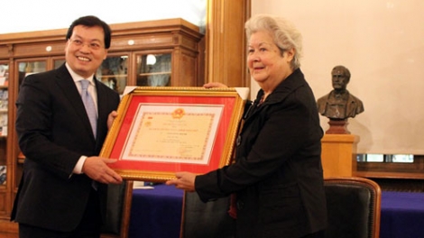 (VOV5) - Ngày 20/12, tại Viện Pasteur ở Paris, Đại sứ Việt Nam tại Pháp cùng đại diện Viện Vệ sinh dịch tễ Trung ương đã trao tặng bà Gennevière Deyme – người Pháp gốc Việt “Kỷ niệm chương Vì sức khỏe nhân dân”, ghi nhận những hỗ trợ của bà đối với các dự án bảo vệ và chăm sóc sức khỏe cho các trẻ em tại Việt Nam và người Việt tại Pháp.
