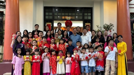 (VOV5) - Lê Thị Thu Hằng đã thăm, chúc Tết và trao tặng sách tiếng Việt cho các giáo viên và gần 40 em học sinh tại lớp dạy tiếng Việt.