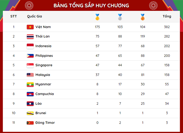 Các vị trí tiếp theo trên bảng tổng sắp huy chương SEA Games 31 lần lượt là Malaysia, Myanmar, Campuchia, Lào, Brunei và Timor Leste.