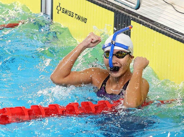 Phạm Thị Thu giành huy chương Vàng và phá kỷ lục SEA Games nội dung 100m vòi hơi chân vịt nữ của môn Lặn với thành tích 40 giây 41. (Ảnh: Phạm Kiên/TTXVN)