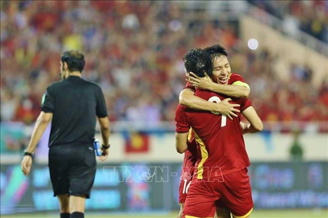 Các cầu thủ U23 Việt Nam ăn mừng bàn thắng - Ảnh: TTXVN |