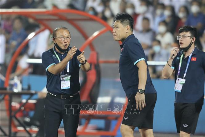 Huấn luyện viên Park Hang-seo và Ban huấn luyện đội tuyển U23 Việt Nam chỉ đạo các cầu thủ từ phía bên ngoài sân. Ảnh: Minh Quyết/TTXVN |