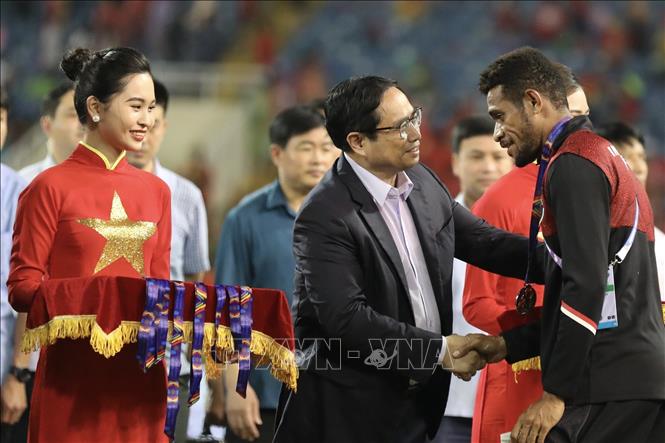 Thủ tướng Phạm Minh Chính trao huy chương Đồng cho các cầu thủ U23 Indonesia -Ảnh: Minh Quyết/TTXVN |
