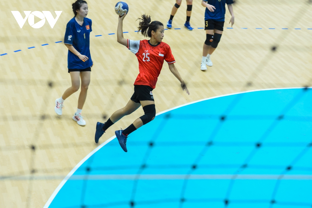Trên bảng xếp hạng nội dung nữ môn bóng ném trong nhà, đội tuyển Việt Nam đang dẫn đầu (6 điểm), Thái Lan (4 điểm), Singapore (0 điểm).