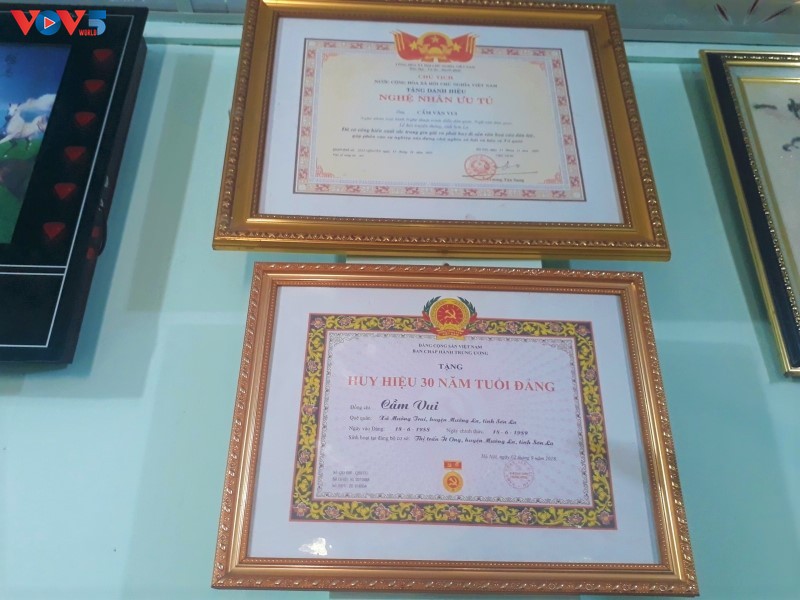 Ông Cầm Vui được trao tặng huy hiệu 30 năm tuổi Đảng và được phong tặng nghệ nhân ưu tú. Ảnh: Tòng Đức Anh/ VOV