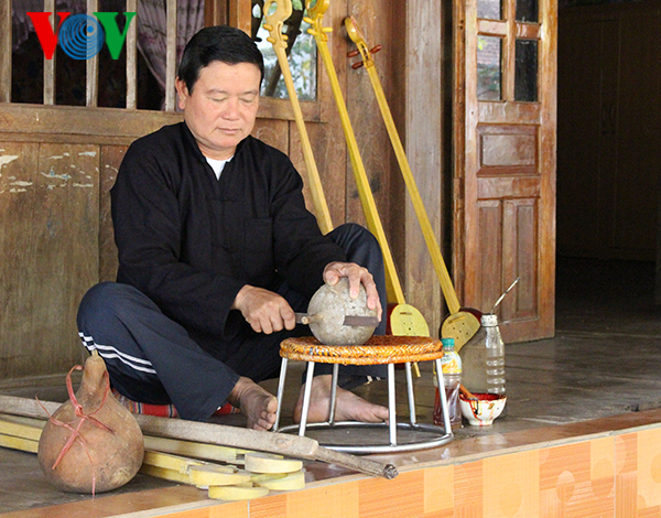 Quả bầu sau khi phơi khô sẽ được đục lỗ xung quanh để tạo âm cho đàn. Kích thước của lỗ đục cũng phải tùy theo kích thước to hay nhỏ của quả bầu. Ông Hòa chia sẻ: “Trước kia các cụ dùi lỗ ở đáy đàn nên khi đánh, ôm vào người, tiếng không thoát ra được. Có 6 điểm đục lỗ, mỗi điểm 9 lỗ, xung quanh có 54 lỗ tất cả. Quả bé thì khoan lỗ bé, quả to khoan lỗ to để nó thoát âm. Khi nào đàn lên, nghe thấy âm nó đạt là được, nếu chưa được mình phải dùi thêm".