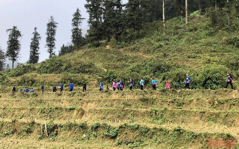 Đoàn lễ gồm tất cả mọi người trong thôn đi vào rừng. Ảnh: Báo Nhân dân |