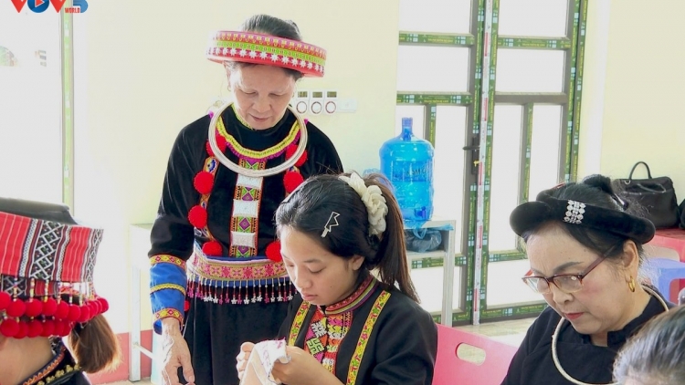 Trong nhà bà Đinh Thị Việt có một căn phòng nhỏ, nơi bà cất giữ rất nhiều sản phẩm truyền thống của người Thái trắng. Từ những tấm chăn đen, chăn đỏ, đến những mảnh vải kẻ xanh, vàng hay những chiếc khăn tím, tất cả đều do chính tay bà Việt dệt. Hằng ngày, bên khung cửi cũ, bà Việt cần mẫn đưa từng sợi chỉ vào khung tạo nên những hoạ tiết mang đặc trưng của người Thái trắng. Dệt không chỉ tạo ra những tấm vải mà trong đó còn chứa đựng những câu chuyện rất riêng của bản làng vùng cao. Bà Đinh Thị Việt cho biết: “Về kỹ thuật dệt, mình nghĩ ra hoa văn kiểu nào, mình sẽ dệt theo kiểu đấy. Mình tự nghiên cứu ở trong khung dệt, lúc mình dùng sợi để pha màu. Đấy là sự sáng tạo của mình. Ngày trước, thanh niên như chúng tôi chăm và chịu khó. Sáng đi làm, chiều tối về là ngồi vào khung dệt vải, gọi nhau đến cùng dệt dưới ánh đèn dầu và còn thấy ánh sáng đèn là còn ở lại dệt đến khi gà gáy.”
