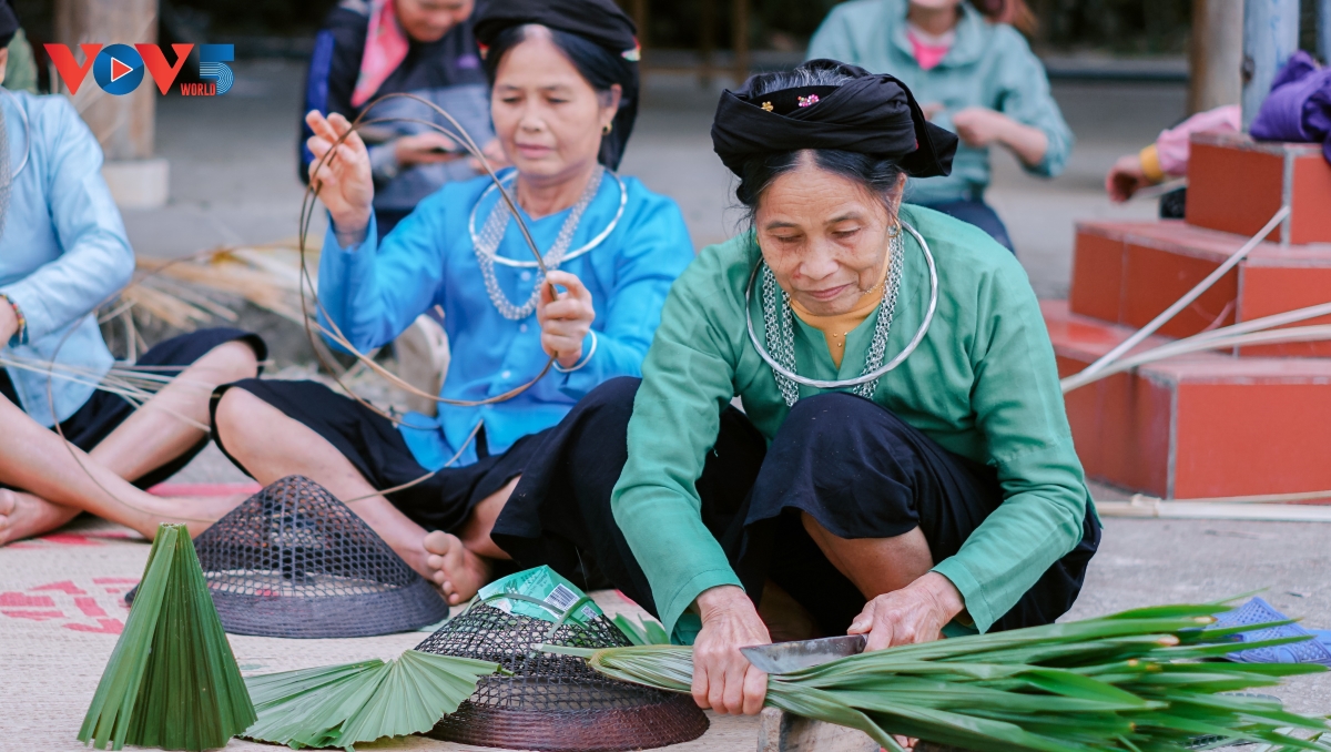 Nón Hai Mê, với thiết kế chóp nhọn và vành rộng, không chỉ là vật dụng quen thuộc trong đời sống hàng ngày mà còn mang đậm dấu ấn văn hóa của người Tày. Ảnh: Vĩnh Phong/VOV5 |