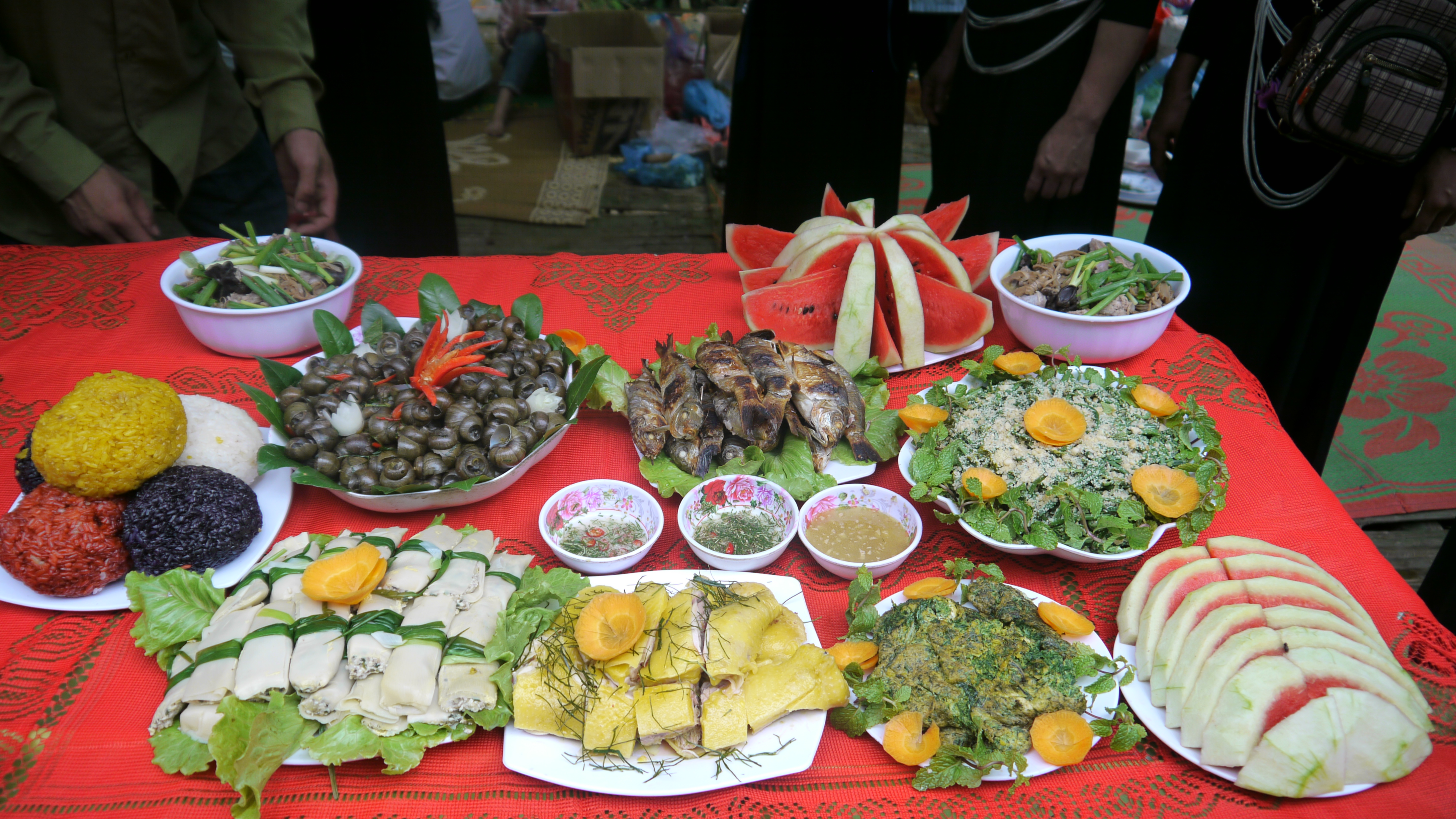 Một mâm cỗ của người Tày tham gia cuộc thi cỗ ngon. Trong đó, có món cá suối nướng, nộm cá hoa chuối và ốc hấp lá chanh được du khách đặc biệt yêu thích.