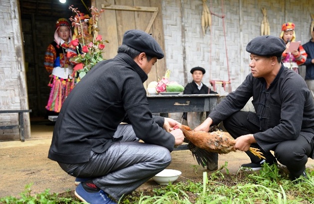 Lễ cúng, thường có 2 thày cúng chính và 1 thày cúng phụ làm lễ. Lễ cúng chính bắt đầu khi chủ nhà dâng lên trước bàn thờ 2 con gà, 42 nắm cơm và 12 bát rượu. Ông Phùng Bảo giải thích thêm: “Lễ vật cúng như vậy là vì theo quan niệm của người Lô Lô, thế giới là do 40 loài cây cối làm con của trời đất. 2 nắm cơm lớn là tượng trưng cho trời và đất, còn 12 chén rượu tương trưng cho 12 tháng trong năm.”