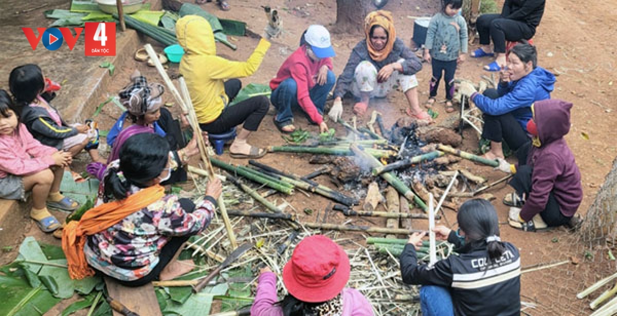Chị H’Vêu, một trong những đầu bếp phục vụ lễ cúng cho biết: Ngày mùng 1 là ngày lễ lúa mới, tất cả mọi người trong đội 1 của mình đều chung tay làm các món ăn để dâng lên các thần. Đây là cơm lam, đây là măng chua xào với thịt heo còn mấy cây chuối xắt xong rồi vò và trộn với thịt chuột rồi bỏ vô lồ ô nướng. Mình sẽ mang xuống nhà rông để mọi người tập trung ăn ở đó.