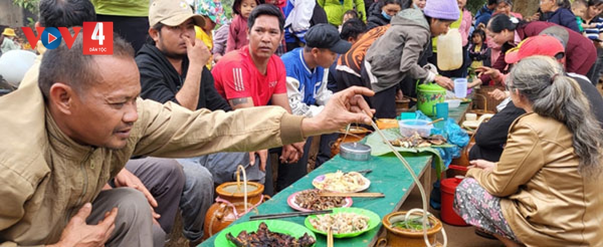 Bà con tập trung tại Nhà Rông để cùng nhau thưởng thức các món ăn truyền thống |