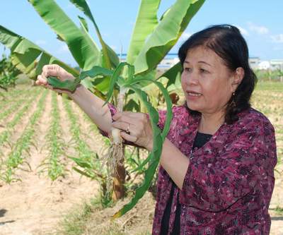 | TS. Nguyễn Thị Ngọc Trâm bên vườn thực nghiệm trồng cây trinh nữ hoàng cung |