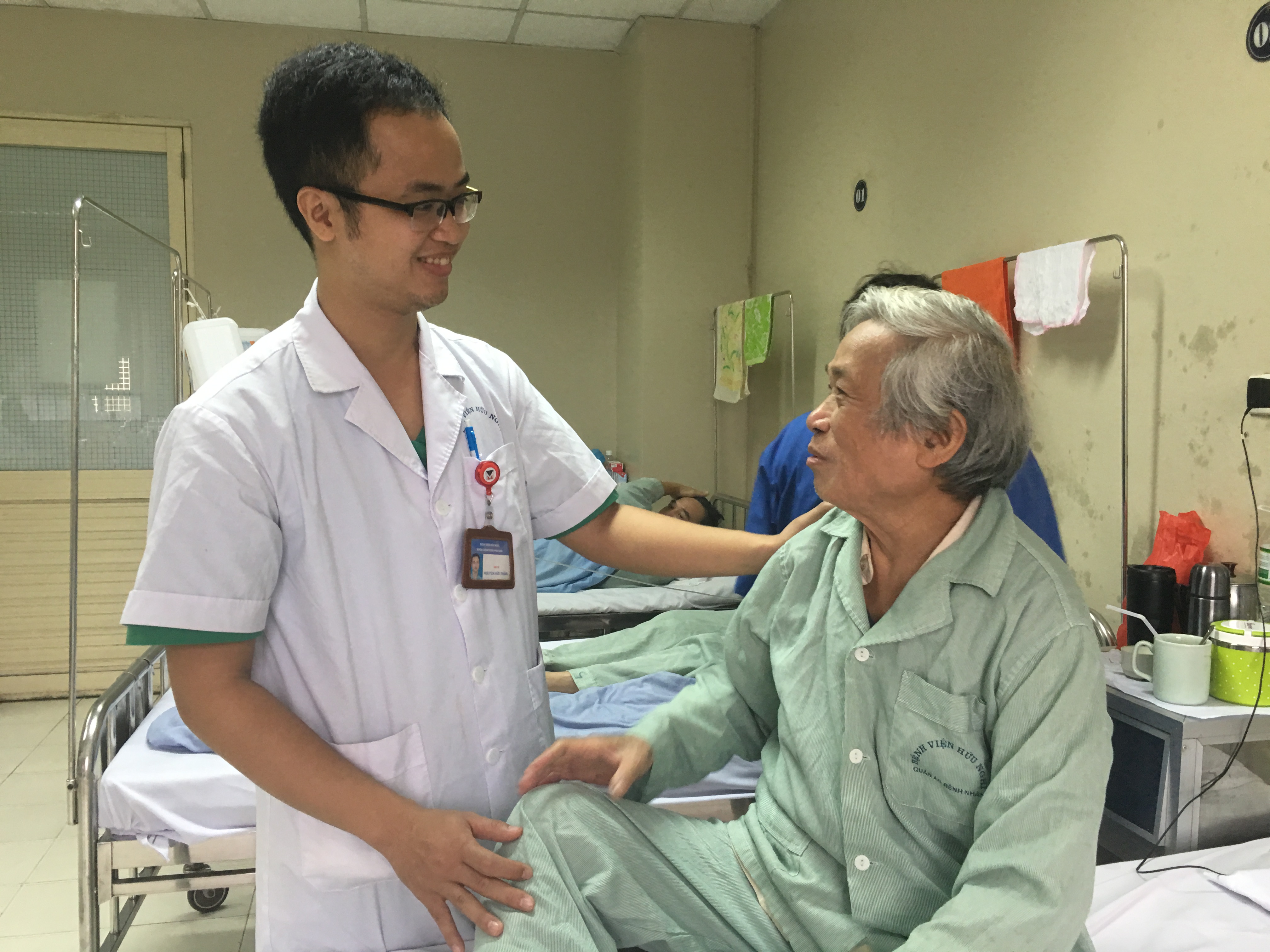 Bác sĩ Nguyễn Hữu Thắng đang thăm khám cho BN vừa bơm xi măng sinh học