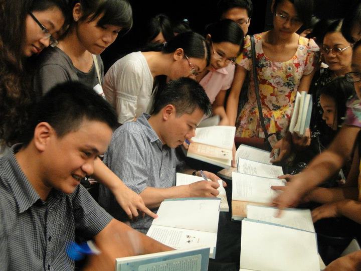 Hai tác giả ký sách mỏi tay