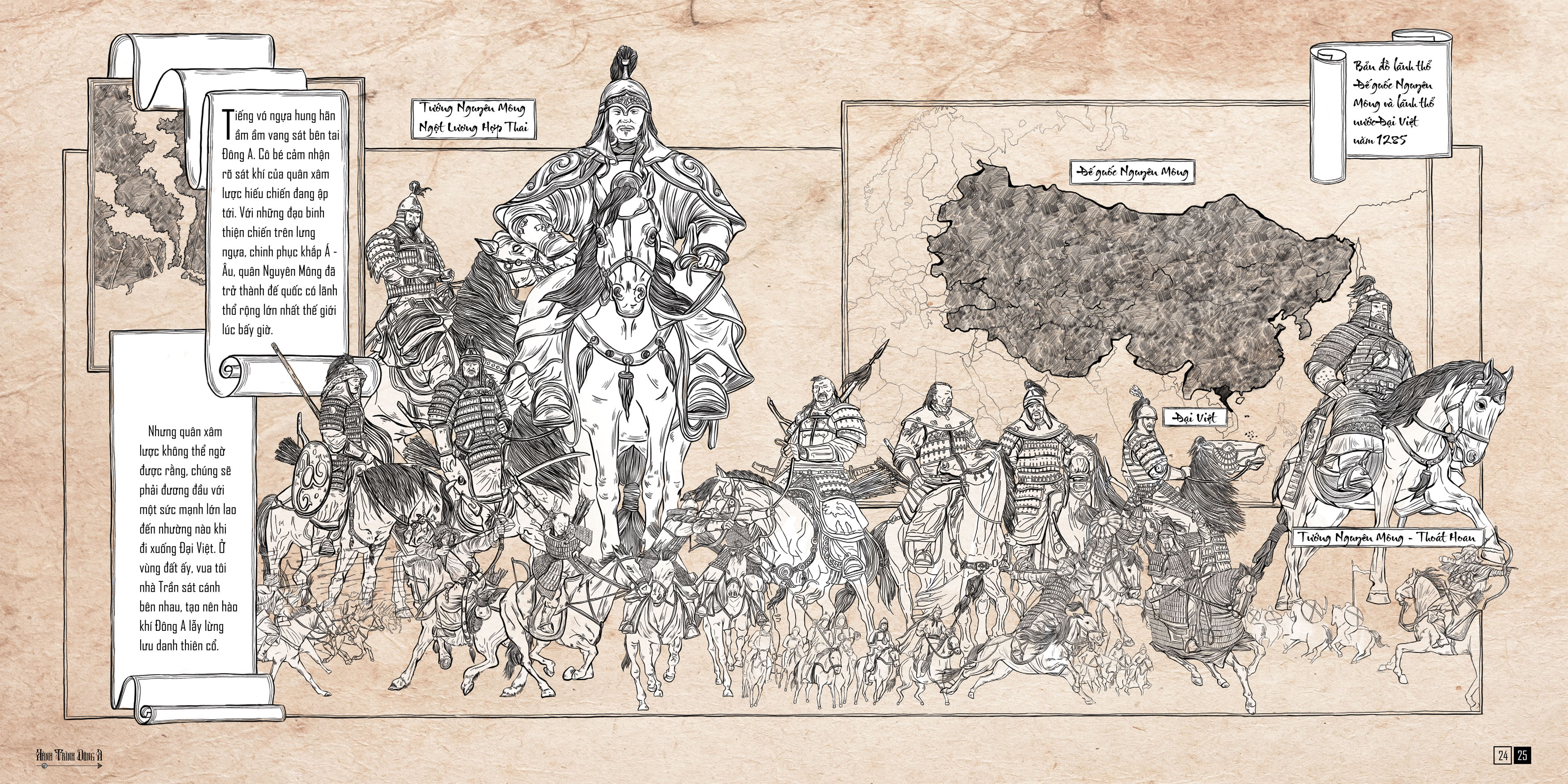 Bên cạnh các chiến công cùng các vị danh tướng, một dung lượng đáng kể của cuốn sách khái quát khung cảnh, đời sống đất nước, con người Đại Việt. Tác giả cung cấp cho người đọc những kiến thức và hình dung về sản vật được làm ra từ đôi tay tài hoa của người Đại Việt như gốm, vải, giấy…, rồi cả lối kiến trúc, điêu khắc mà thế hệ hậu bối ngày nay vẫn luôn ngưỡng vọng. Cuộc sống bình yên hoà trong những hương sắc thiên nhiên, những ngôi làng trù phú, những cánh đồng lúa chín, con đường làng hiện ra qua những bức tranh công phu, từ đại cảnh đến tiểu cảnh, trực tả, được thực hiện tỉ mỉ theo lối tranh khắc gỗ.