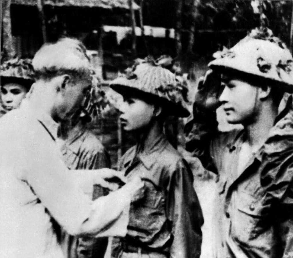 Bác Hồ gắn huy hiệu chiến sỹ Điện Biên Phủ cho chiến sĩ Hoàng Đăng Vinh, người trực tiếp bắt tướng De Castries, 1954 - Ảnh: Gia đình NSNA Triệu Đại cung cấp. |
