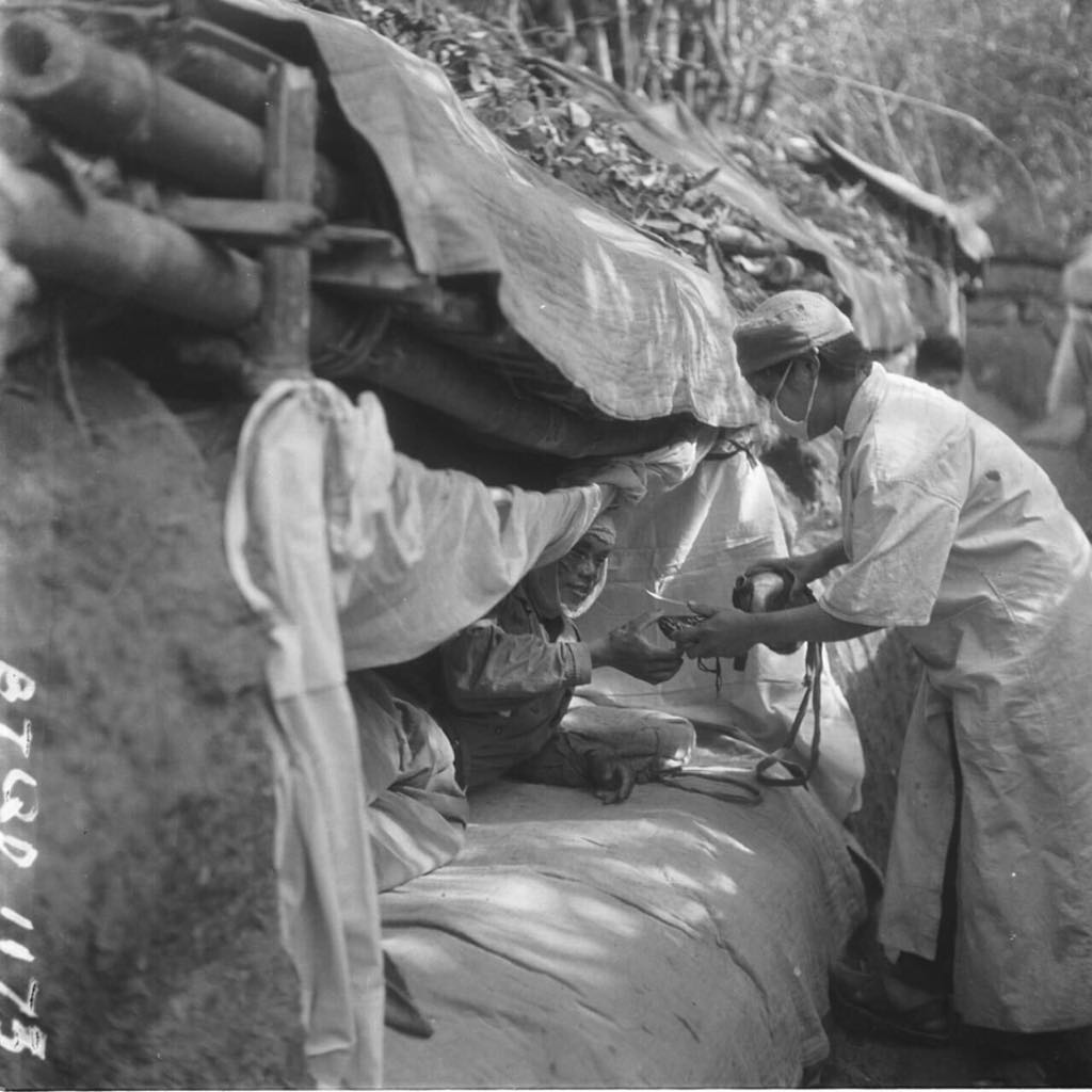 Một bức ảnh xúc động nữa, là ảnh trạm quân y. Trạm quân y của Điện Biên Phủ là ở dưới hào. Bác sĩ, hộ lý, thương binh nằm dưới chiến hào. Nhìn các hộ lý chăm sóc thương binh mới thấy rất là cảm động.