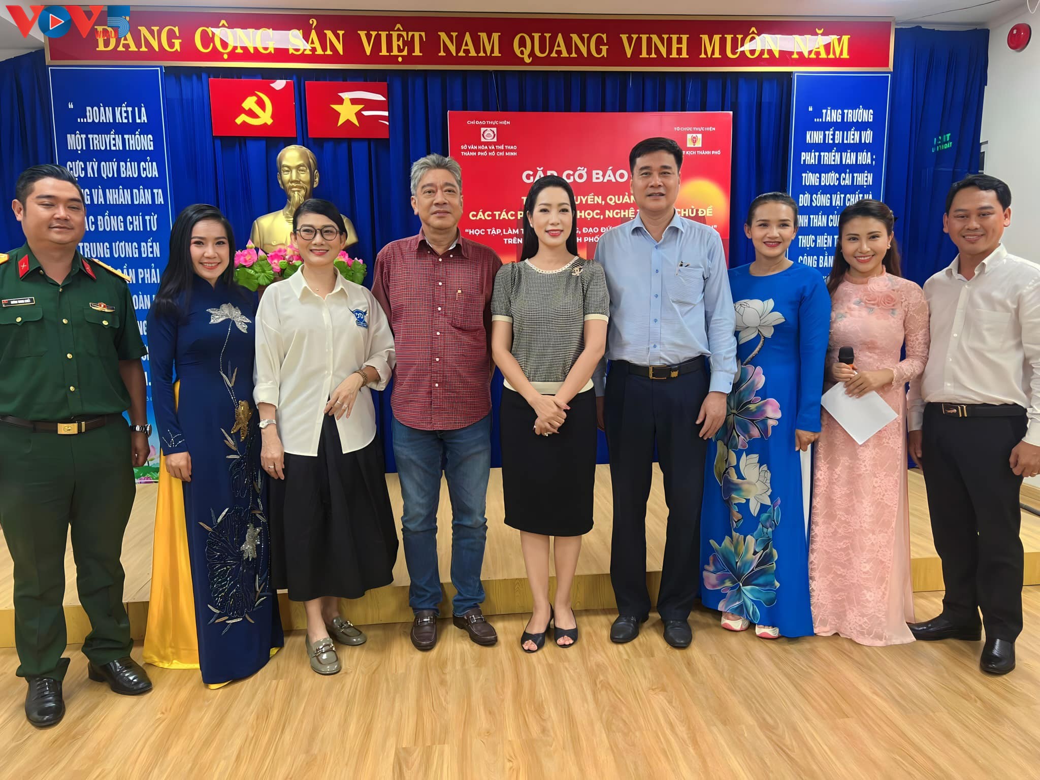 Đại diện Ban tuyên giáo Thành ủy chụp hình lưu niệm với người đứng đầu các đơn vị sân khấu trong buổi Gặp gỡ báo chí mới đây tại Nhà hát kịch Thành phố - Ảnh: Vũ Nga |