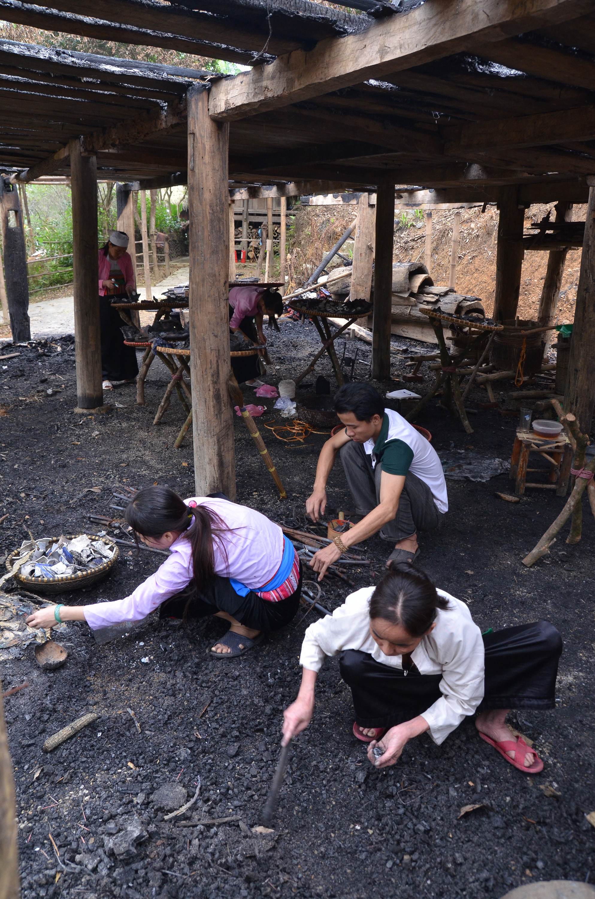 | Nhân viên Bảo tàng Không gian Văn hóa Mường thu thập và phân loại các di vật còn sót của nhà Lang sau đám cháy. |