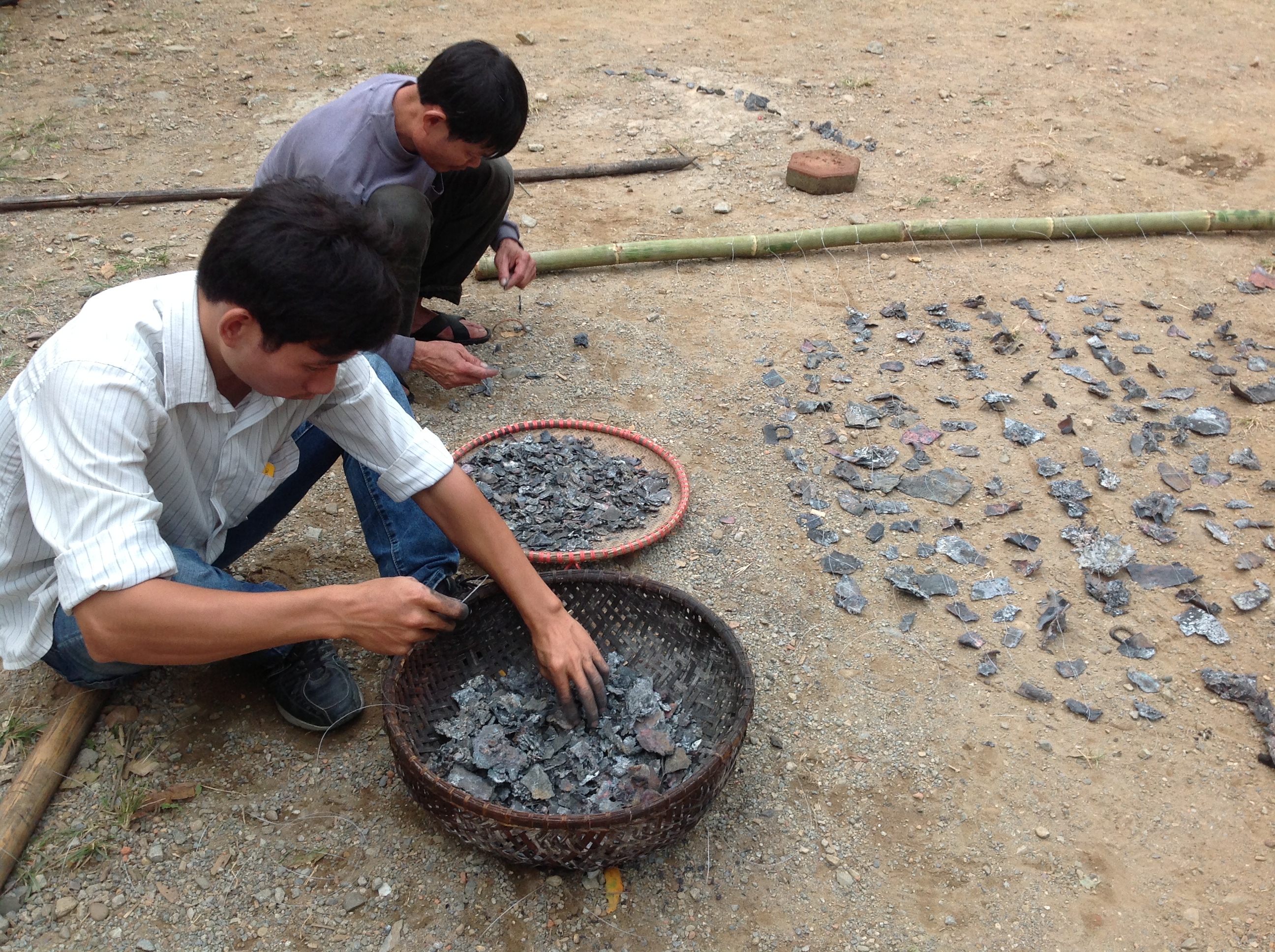 | Hình ảnh tác phẩm (đang thực hiện) của Thái Nhật Minh, bằng các mảnh sắt, đồng, đồ gốm vỡ di vật của nhà Lang. |