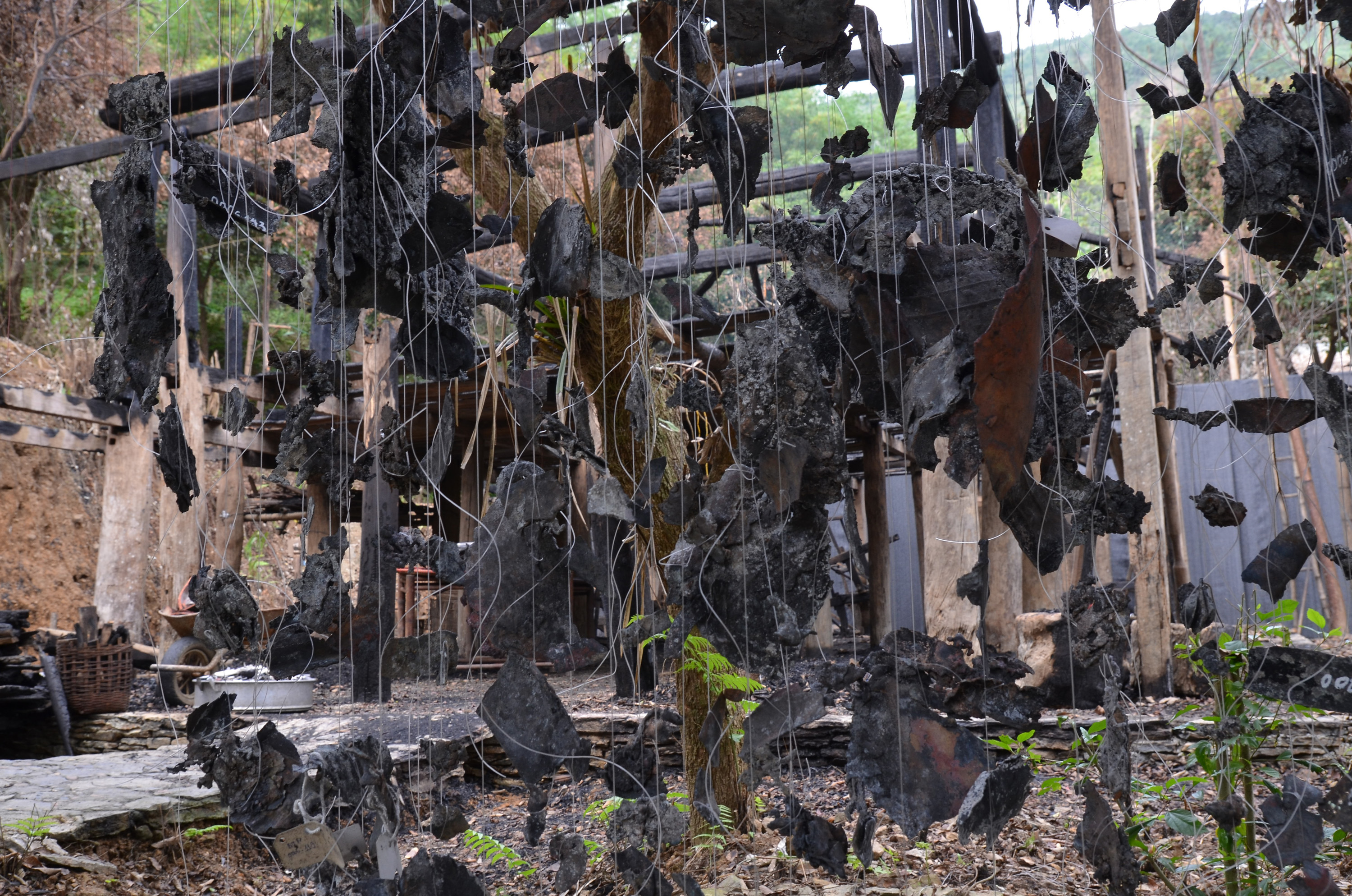 | Nhà Lang sau đám cháy ngày 24/10/2013. Mặt nền, các vì kèo, không gian bên trong và ngoài khu vực này sẽ được sử dụng để trưng bày các sáng tác nghệ thuật đương đại của nghệ sỹ trong sự kiện “KÝ ỨC NHÀ LANG”. |