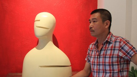 | Lê Thiết Cương và “Chân dung 2” - tác phẩm trong triển lãm điêu khắc Mặt của anh. Ảnh: N.M.Hà/ Báo Tiền phong |