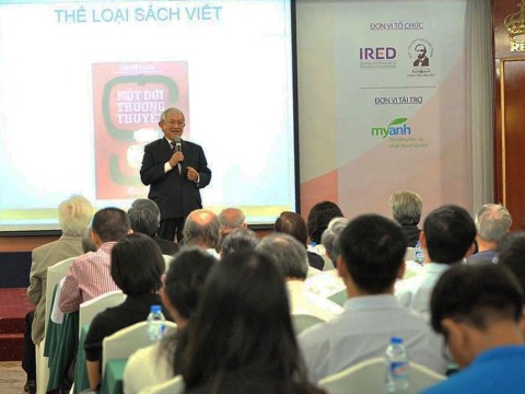 | Giáo sư Phan Văn Trường phát biểu khi lần đầu nhận giải ở hạng mục sách Quản trị cho cuốn "Một đời thương thuyết". Ảnh: thethaovanhoa.vn |