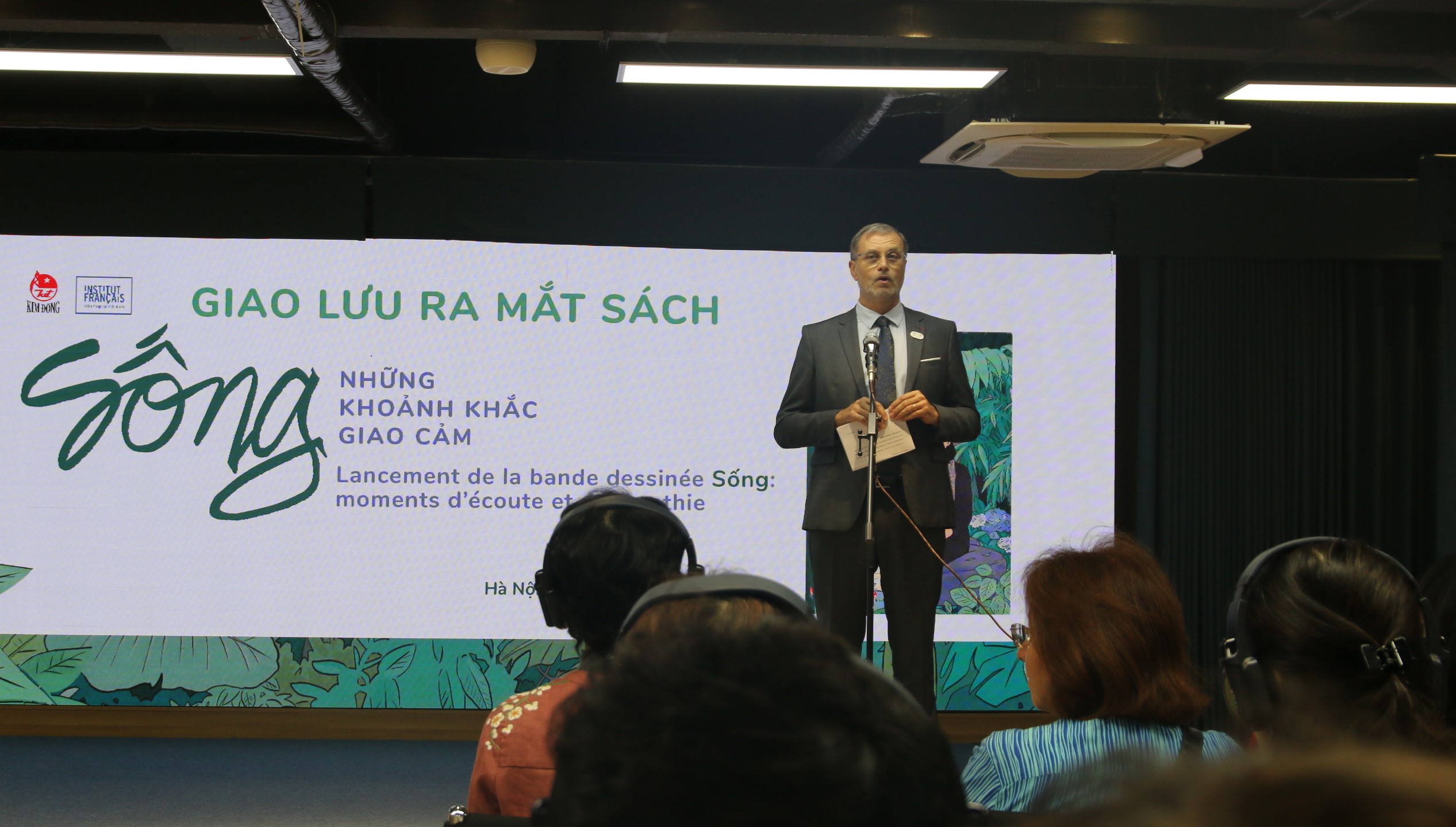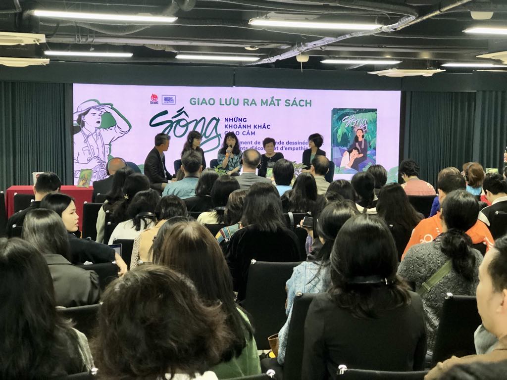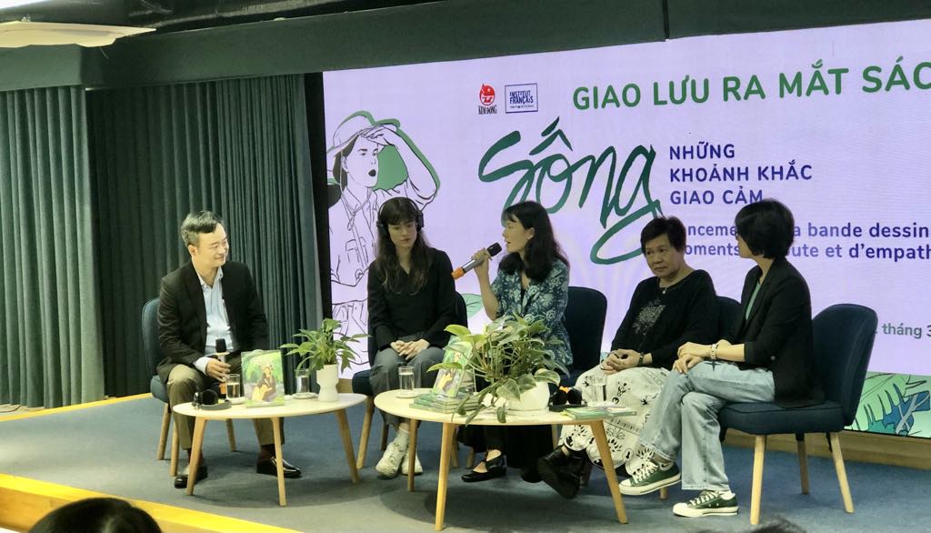 Các tác giả và khách mời tại buổi ra mắt tiểu thuyết bằng tranh Sống, bản tiếng Việt, tại NXB Kim Đồng sáng 12/03/2024