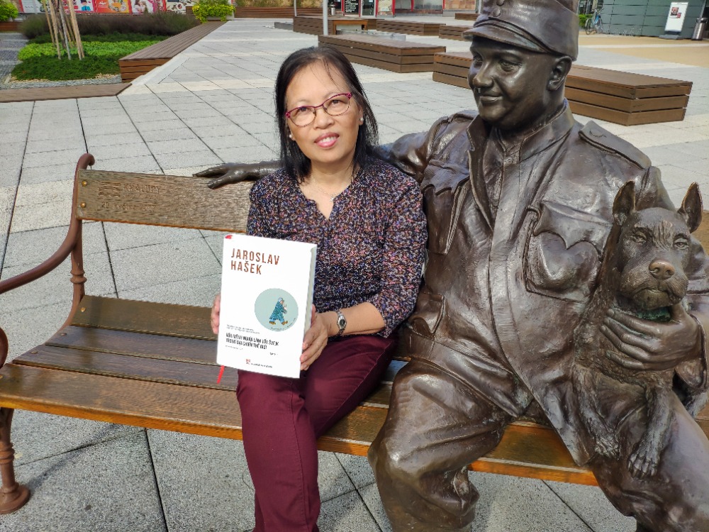 Dịch giả Bình Slavická cùng tượng Švejk ở Kralupy- CHSéc |