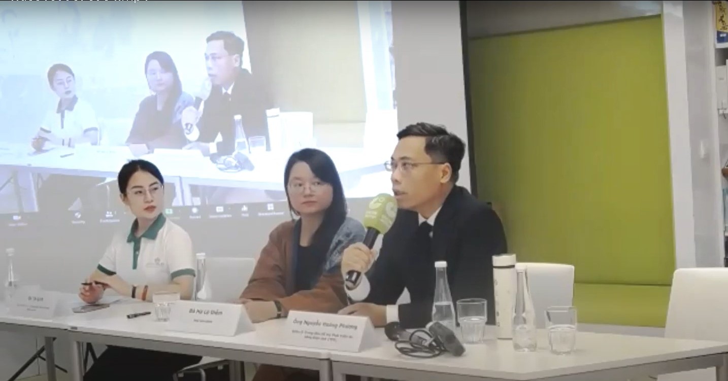 Chị Tô Linh (cán bộ GreenHub) , đạo diễn Hà Lệ Diễm và ông Nguyễn Hoàng Phương (điều hành TPD) tại buổi họp báo giời thiệu Dự án. |