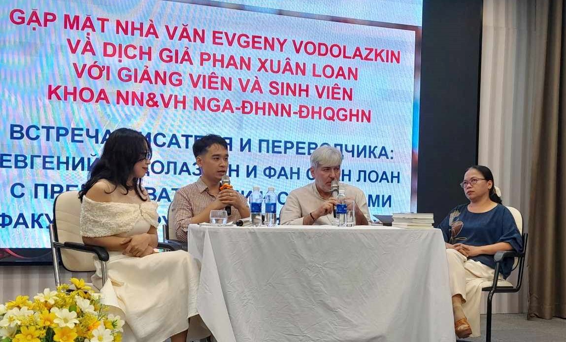 Nhà văn Evgeny Vodolazkin và dịch giả Phan Xuân Loan (ngoài cùng bên phải) tại buổi giao lưu, gặp mặt với giảng viên, sinh viên Khoa ngôn ngữ và văn hóa Nga - Đại học Ngoại ngữ - Đại học Quốc gia Hà Nội. - Ảnh: Hoàng Hằng |
