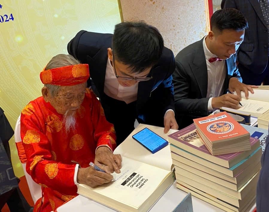 Nhà nghiên cứu Nguyễn Đình Tư và nhà văn Trương Quý ký tặng sách cho độc giả tại hội trường Lễ trao giải Sách Quốc gia lần thứ VII. - Ảnh: Ngân Huyền |