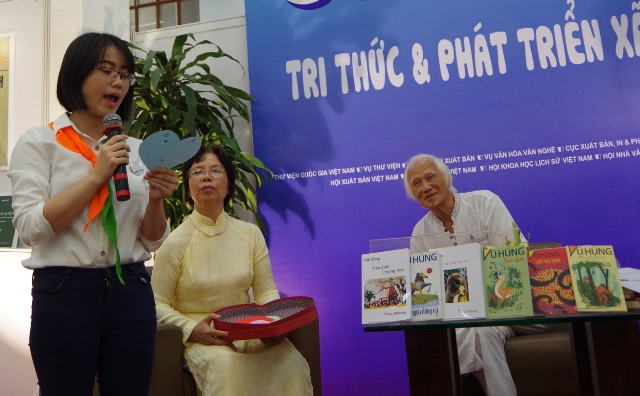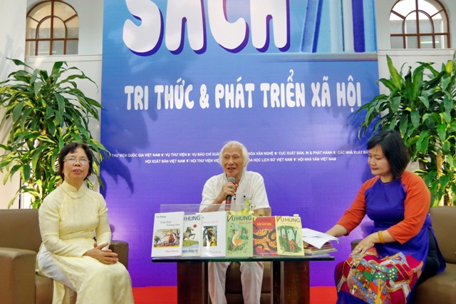 | Từ trái qua phải: nhà văn Lê Phương Liên, nhà văn Vũ Hùng, tiến sĩ, dịch giả Nguyễn Thụy Anh. Dịch giả Nguyễn Thụy Anh kể: “Trong rất nhiều ý kiến nhận xét về cái hay của tác phẩm Vũ Hùng, hậm chí có một bạn nhỏ ở Câu lạc bộ Đọc sách cùng con của chúng tôi còn nói rằng chắc là ông đã từng là một con voi” |