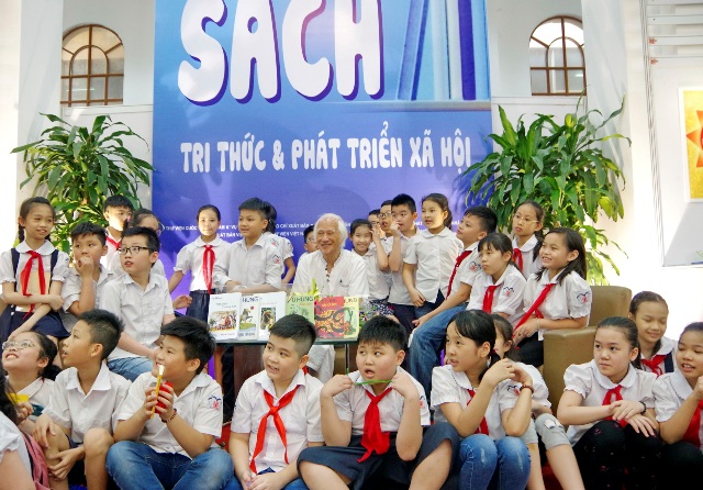 | Niềm hạnh phúc của "ông tiên của rừng xanh" 87 tuổi Vũ Hùng giữa bạn đọc nhỏ tuổi. - Ảnh: Tuấn Hưng |
